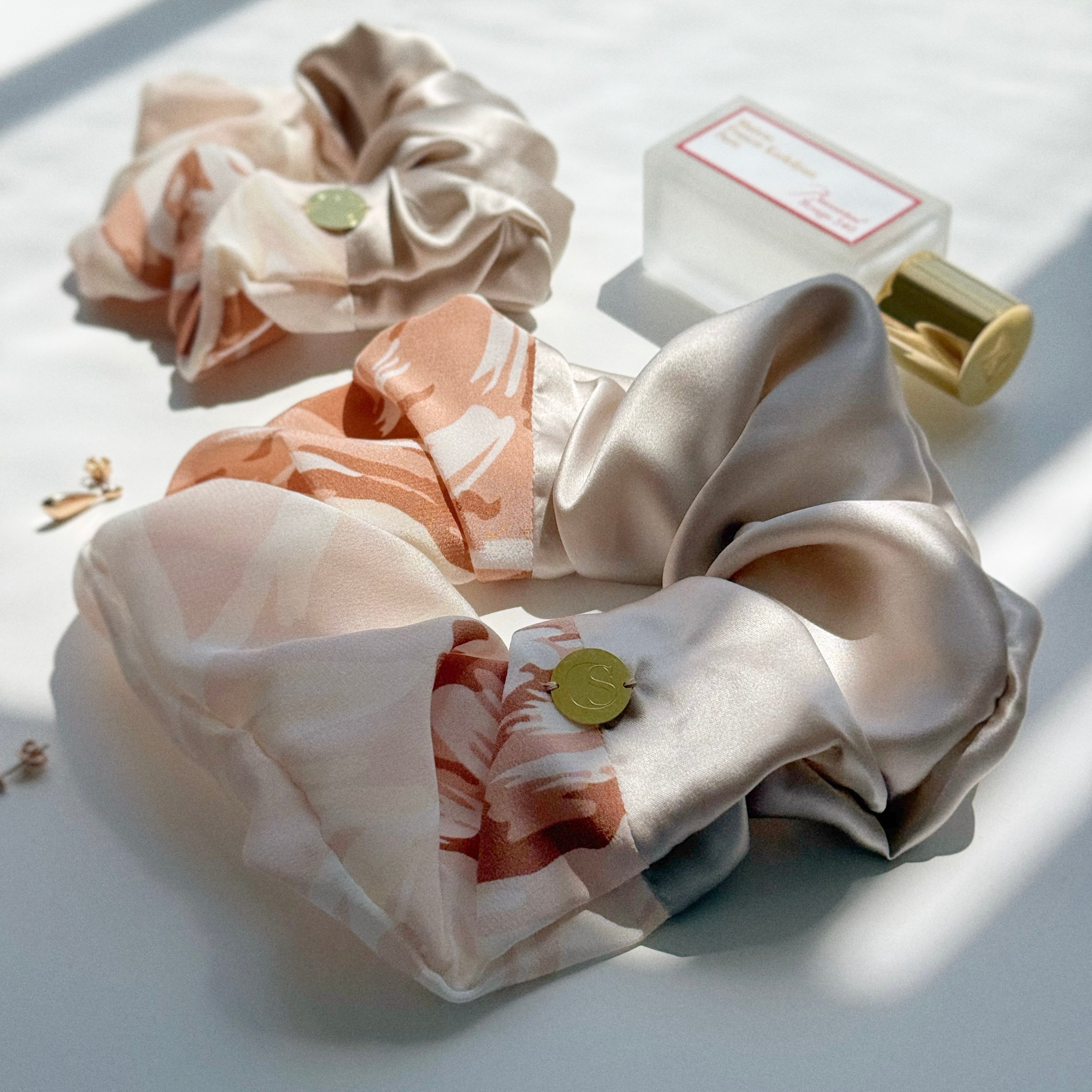 This gorgeous jumbo scrunchie features a stunning two-tone design, blending the rich Oyster silk satin with a designer-printed silk crepe de chine. Offering a secure hold while preventing unwanted creases and hair breakage.